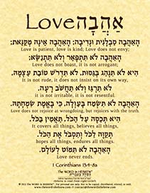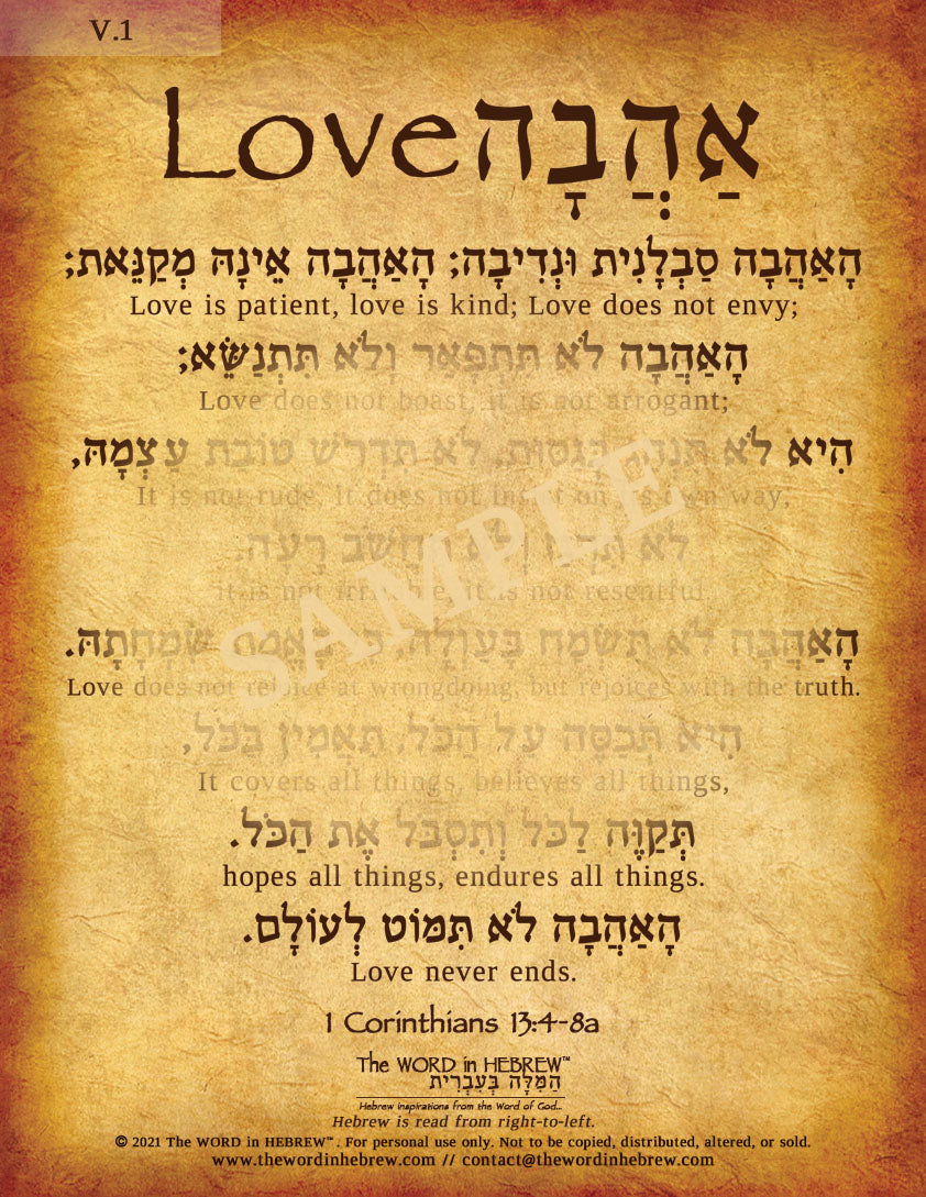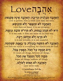 These verses of 1 Corinthians 13:4-8a probably make the most profound description of the true meaning of love! This poster features the Hebrew & English of 1 Corinthians 13:4-8a (the original language is Greek). Will makes a beautiful & blessed addition to any home or office, a wonderful gift to a loved one or for weddings.