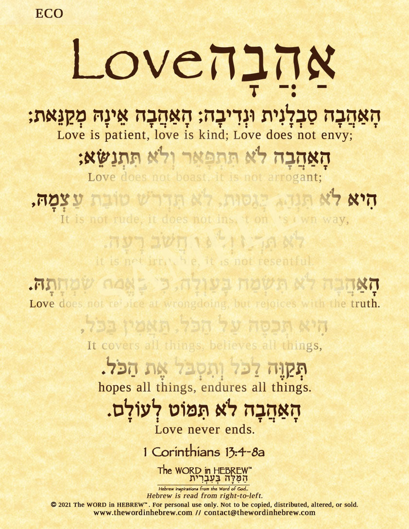 These verses of 1 Corinthians 13:4-8a probably make the most profound description of the true meaning of love! This poster features the Hebrew & English of 1 Corinthians 13:4-8a (the original language is Greek). Will makes a beautiful & blessed addition to any home or office, a wonderful gift to a loved one or for weddings.