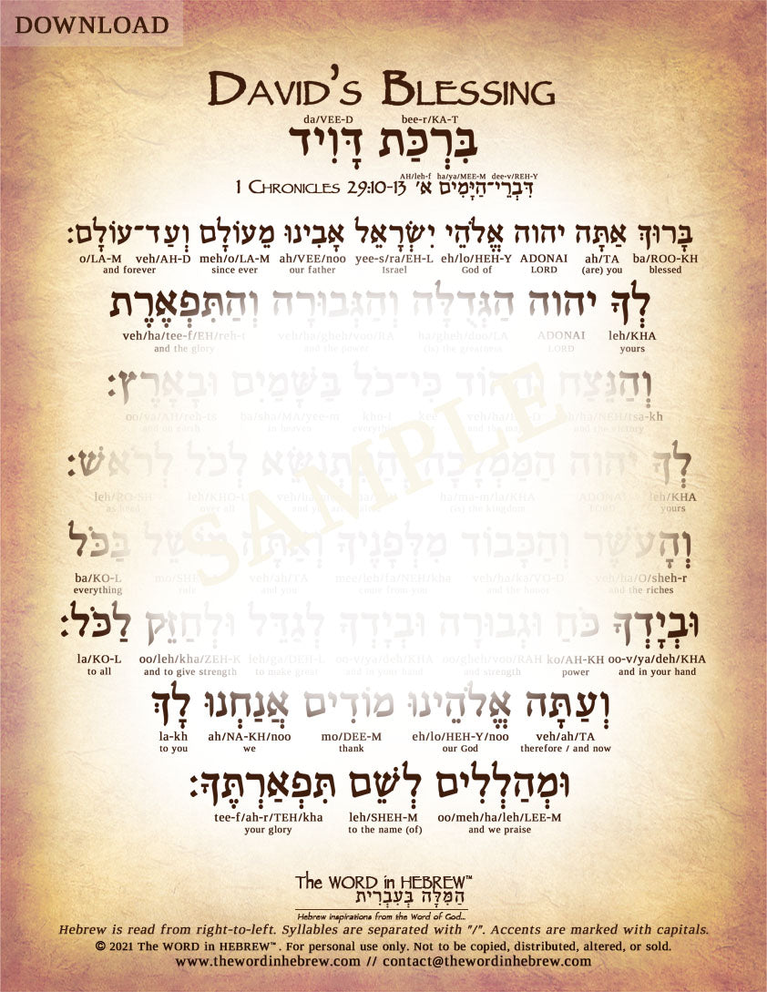 This print features the biblical Hebrew text of 1 Chronicles 29:10-13, also known as "David's Prayer" with each Hebrew word transliterated (broken into syllables) and translated into English. With minimal effort you will learn to pronounce each word in Hebrew and understand what it means within the context. Perfect for biblical Hebrew study and makes a beautiful & blessed addition to any home or office.