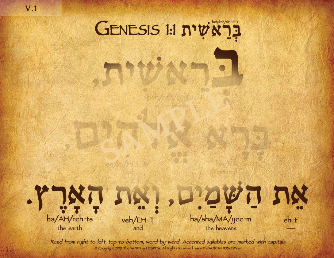 This poster features the biblical Hebrew text of Genesis 1:1 with each Hebrew word broken into syllables and transliterated using the English alphabet. With minimal effort you will learn to pronounce each word in Hebrew and understand what it means within the context. Perfect for biblical Hebrew study and makes a beautiful & blessed addition to any home or office.