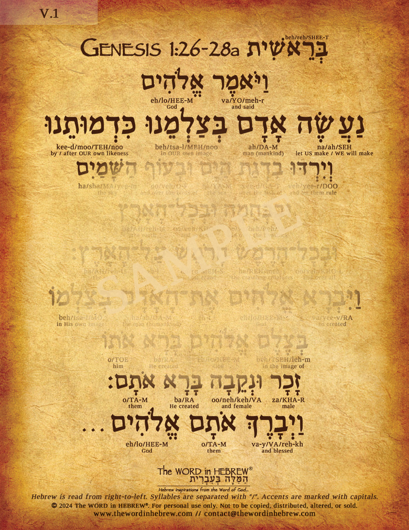 Learn Genesis 1:26-28a in Hebrew! This poster features the biblical Hebrew text of Genesis 1:26-28a with each Hebrew word broken into syllables and transliterated using the English alphabet. With minimal effort you will learn to pronounce each word in Hebrew and understand what it means within the context. Perfect for biblical Hebrew study and makes a beautiful & blessed addition to any home or office.