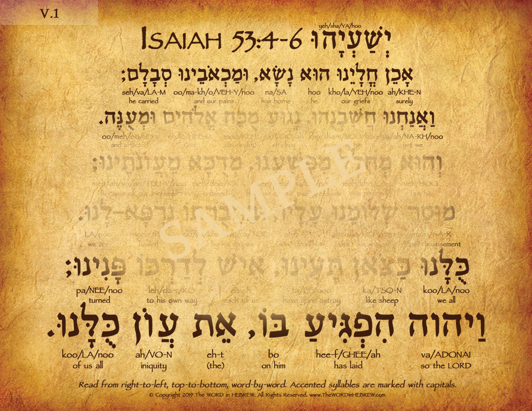 This poster features the biblical Hebrew text of Isaiah 53:4-6 with each Hebrew word transliterated (broken into syllables) and translated into English. With minimal effort you will learn to pronounce each word in Hebrew and understand what it means within the context. Perfect for biblical Hebrew study and makes a beautiful & blessed addition to any home or office.