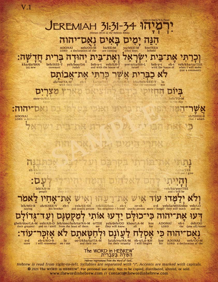 Learn Jeremiah 31:31-34 in Hebrew! This poster features the biblical Hebrew text of Jeremiah 31:31-34 with each Hebrew word transliterated (broken into syllables) and translated into English. With minimal effort you will learn to pronounce each word in Hebrew and understand what it means within the context. Perfect for biblical Hebrew study and makes a beautiful & blessed addition to any home or office.