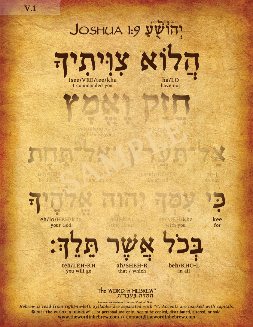 Learn Joshua 1:9 in Hebrew! This poster features the biblical Hebrew text of Joshua 1:9 with each Hebrew word transliterated (broken into syllables) and translated into English. With minimal effort you will learn to pronounce each word in Hebrew and understand what it means within the context. Perfect for biblical Hebrew study and makes a beautiful & blessed addition to any home or office.