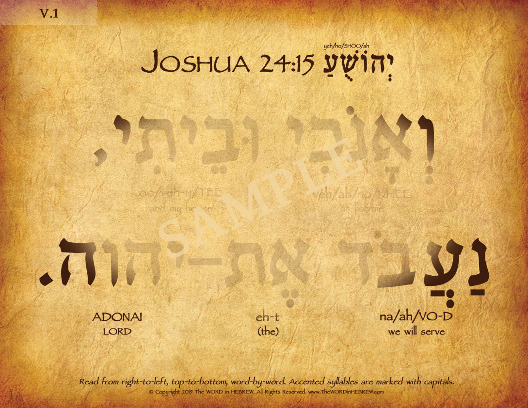 Learn Joshua 24:15 in Hebrew! This poster features the biblical Hebrew text of Joshua 24:15 with each Hebrew word transliterated (broken into syllables) and translated into English. With minimal effort you will learn to pronounce each word in Hebrew and understand what it means within the context. Perfect for biblical Hebrew study and makes a beautiful & blessed addition to any home or office.