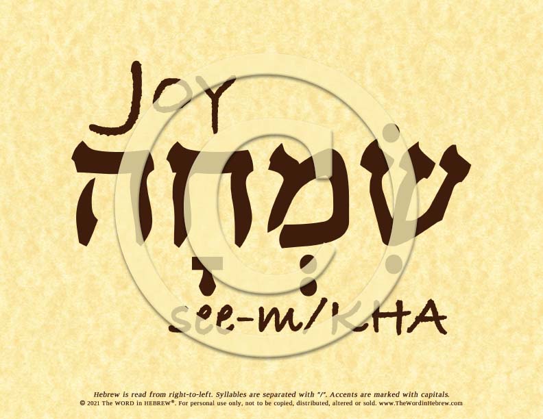 The Hebrew word for "Joy" with transliteration & translation in English, so you can learn how to say "Joy" in Hebrew. Perfect for Hebrew study and inspiration and will make a beautiful & blessed addition to any home or office.