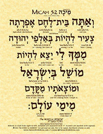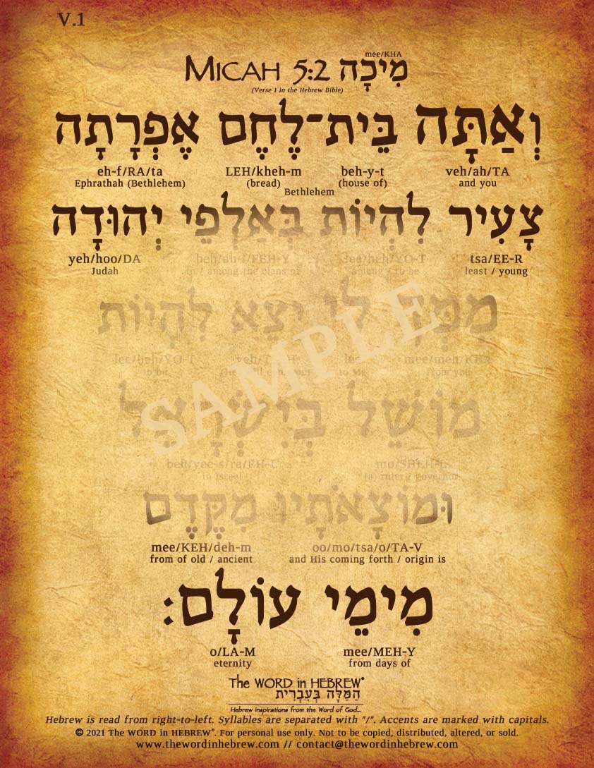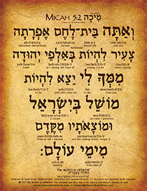 Learn Micah 5:2 in Hebrew! This poster features the biblical Hebrew text of Micah 5:2 with each Hebrew word transliterated (broken into syllables) and translated into English. With minimal effort you will learn to pronounce each word in Hebrew and understand what it means within the context. Perfect for biblical Hebrew study and makes a beautiful & blessed addition to any home or office.