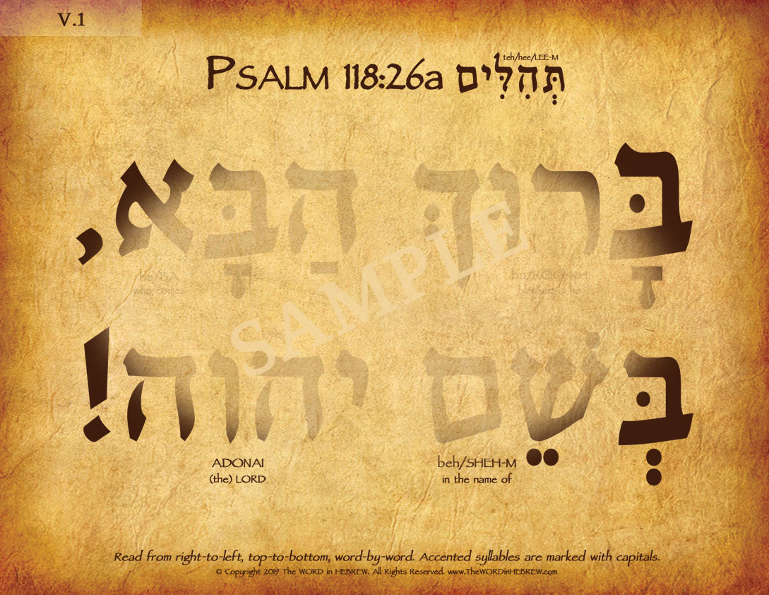 Learn Psalm 118:26a in Hebrew! This poster features the biblical Hebrew text of Psalm 118:26a with each Hebrew word transliterated (broken into syllables) and translated into English. With minimal effort you will learn to pronounce each word in Hebrew and understand what it means within the context. Perfect for biblical Hebrew study and makes a beautiful & blessed addition to any home or office.