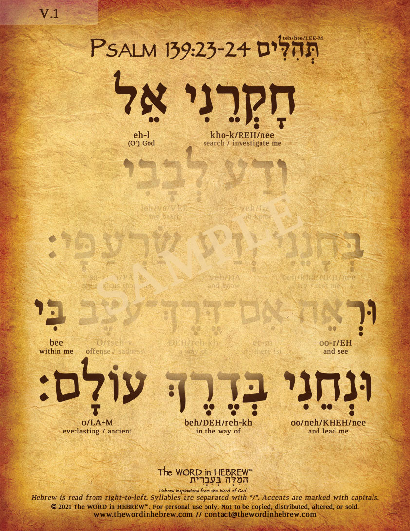 Learn Psalm 139:23-24 in Hebrew! This poster features the biblical Hebrew text of Psalm 139:23-24 with each Hebrew word transliterated (broken into syllables) and translated into English. With minimal effort you will learn to pronounce each word in Hebrew and understand what it means within the context. Perfect for biblical Hebrew study and makes a beautiful & blessed addition to any home or office.