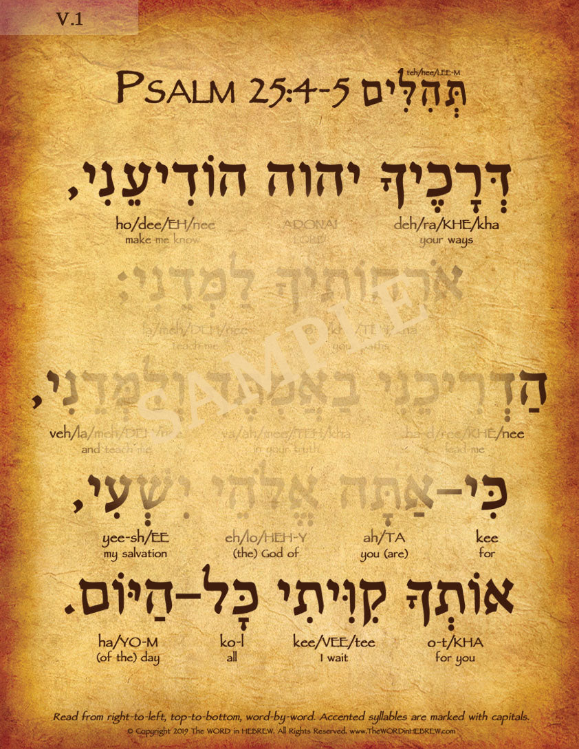 This poster features the biblical Hebrew text of Psalm 25:4-5 with each Hebrew word transliterated (broken into syllables) and translated into English. With minimal effort you will learn to pronounce each word in Hebrew and understand what it means within the context. Perfect for biblical Hebrew study and makes a beautiful & blessed addition to any home or office.