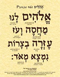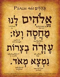 Learn Psalm 46:1 in Hebrew! This poster features the biblical Hebrew text of Psalm 46:1 with each Hebrew word transliterated (broken into syllables) and translated into English. With minimal effort you will learn to pronounce each word in Hebrew and understand what it means within the context. Perfect for biblical Hebrew study and makes a beautiful & blessed addition to any home or office.