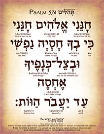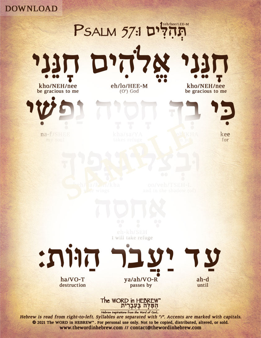 Learn Psalm 57:1 in Hebrew! This poster features the biblical Hebrew text of Psalm 57:1 with each Hebrew word transliterated (broken into syllables) and translated into English. With minimal effort you will learn to pronounce each word in Hebrew and understand what it means within the context. Perfect for biblical Hebrew study and makes a beautiful & blessed addition to any home or office.