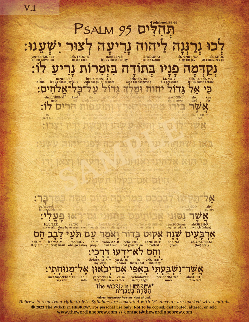 Learn Psalm 95 in Hebrew! This poster features the biblical Hebrew text of Psalm 95 with each Hebrew word transliterated (broken into syllables) and translated into English. With minimal effort you will learn to pronounce each word in Hebrew and understand what it means within the context. Perfect for biblical Hebrew study and makes a beautiful & blessed addition to any home or office.