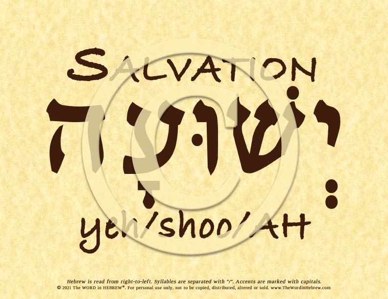 The Hebrew word for "Salvation" Yeshuah and with transliteration & translation in English, so you can learn how to say Salvation in Hebrew and understand the word in its biblical context. Perfect for Hebrew study and inspiration and will make a beautiful & blessed addition to any home or office.