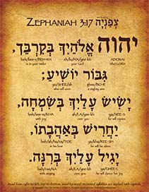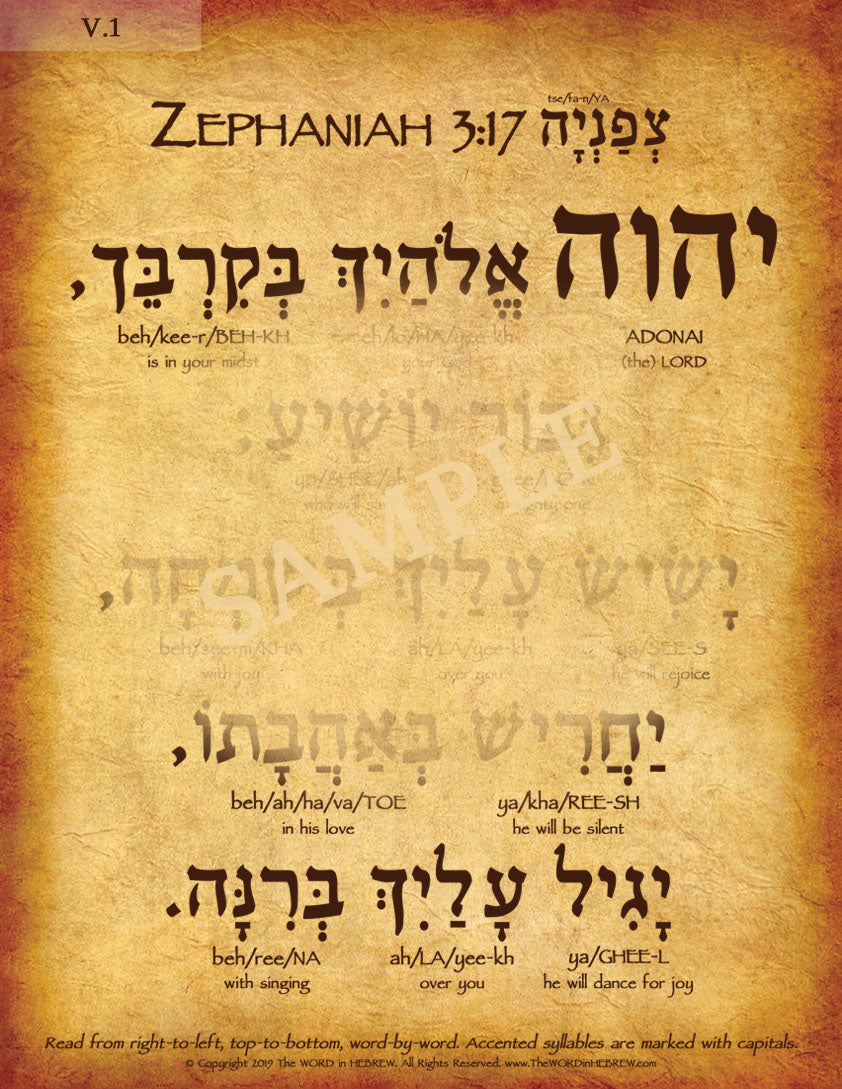 Learn Zephaniah 3:17 in Hebrew! This poster features the biblical Hebrew text of Zephaniah 3:17 with each Hebrew word transliterated (broken into syllables) and translated into English. With minimal effort you will learn to pronounce each word in Hebrew and understand what it means within the context. Perfect for biblical Hebrew study and makes a beautiful & blessed addition to any home or office.